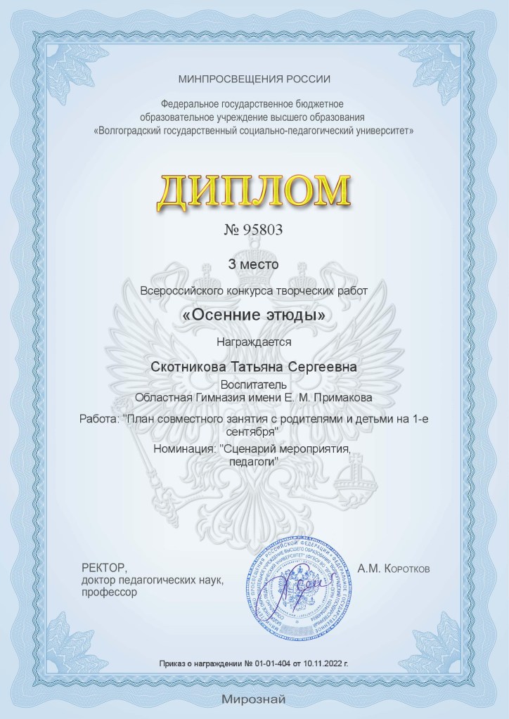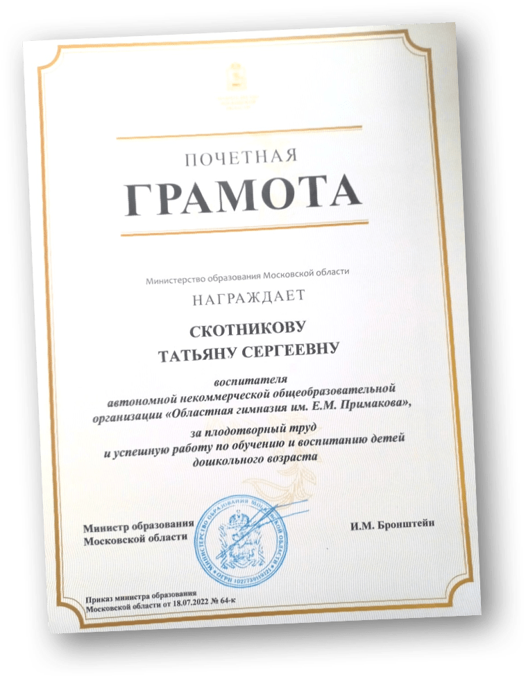 Почетная грамота Министерства образования Московской области за плодотворный труд и успешную работу по обучению и воспитанию детей дошкольного возраста