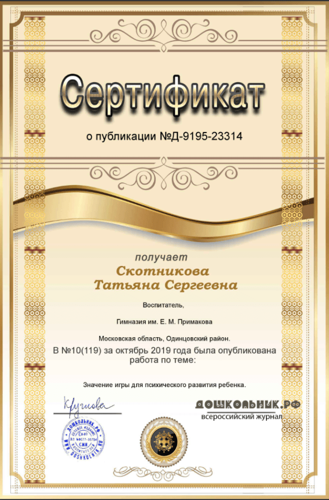 Воспитатель публикует материалы в журналах и СМИ. Публикации в журнале «Дошкольник. РФ» можно найти на сайте: