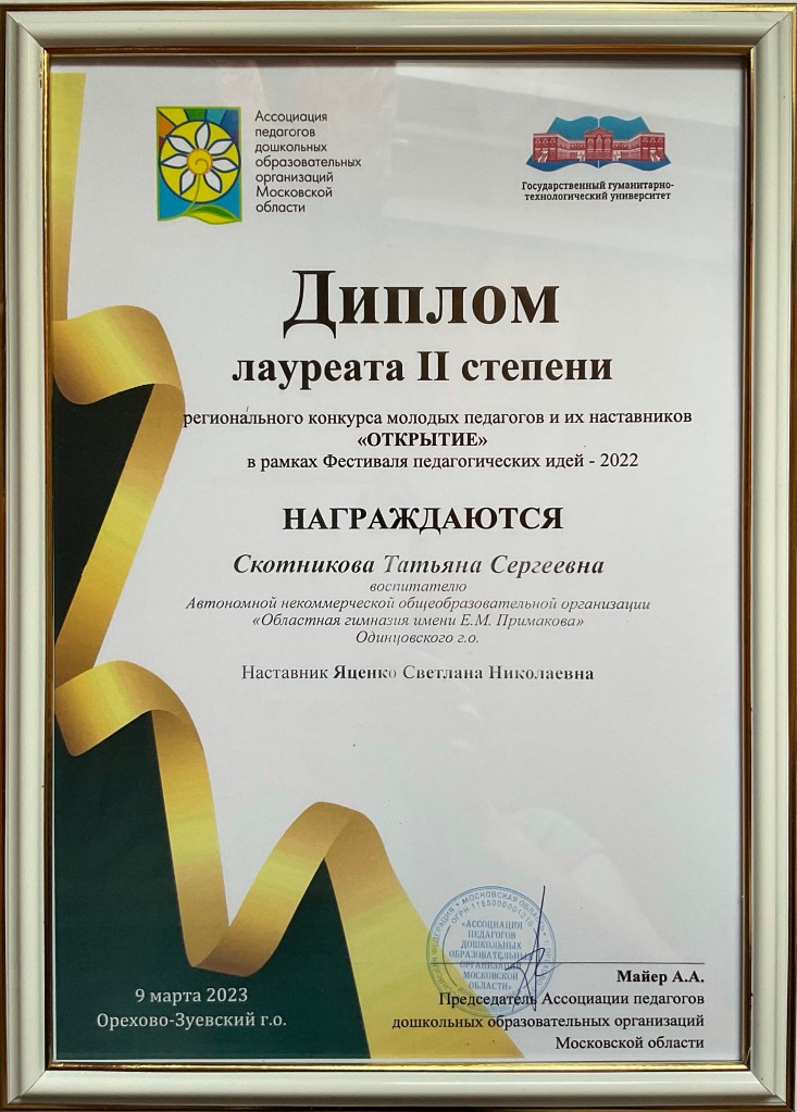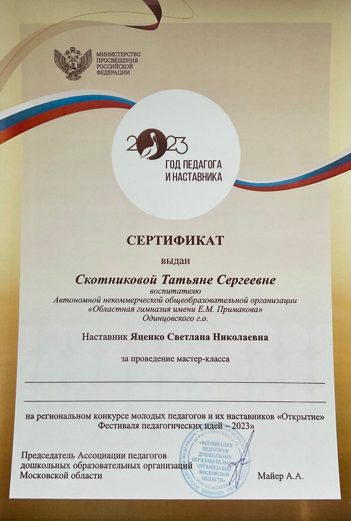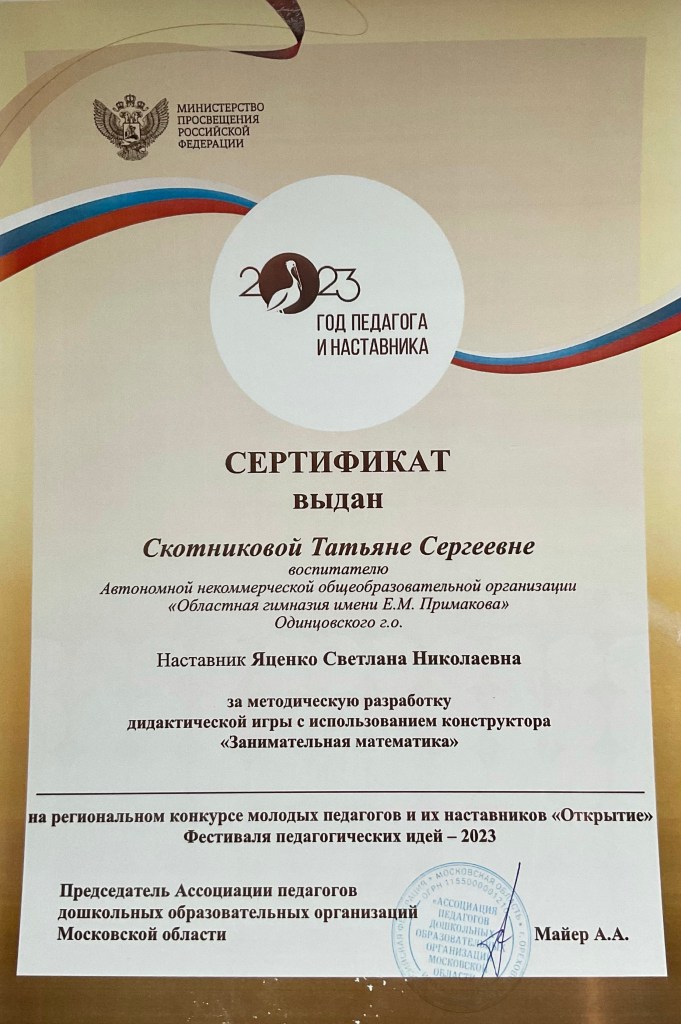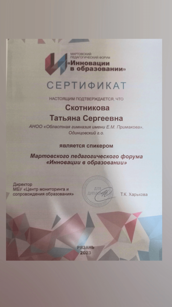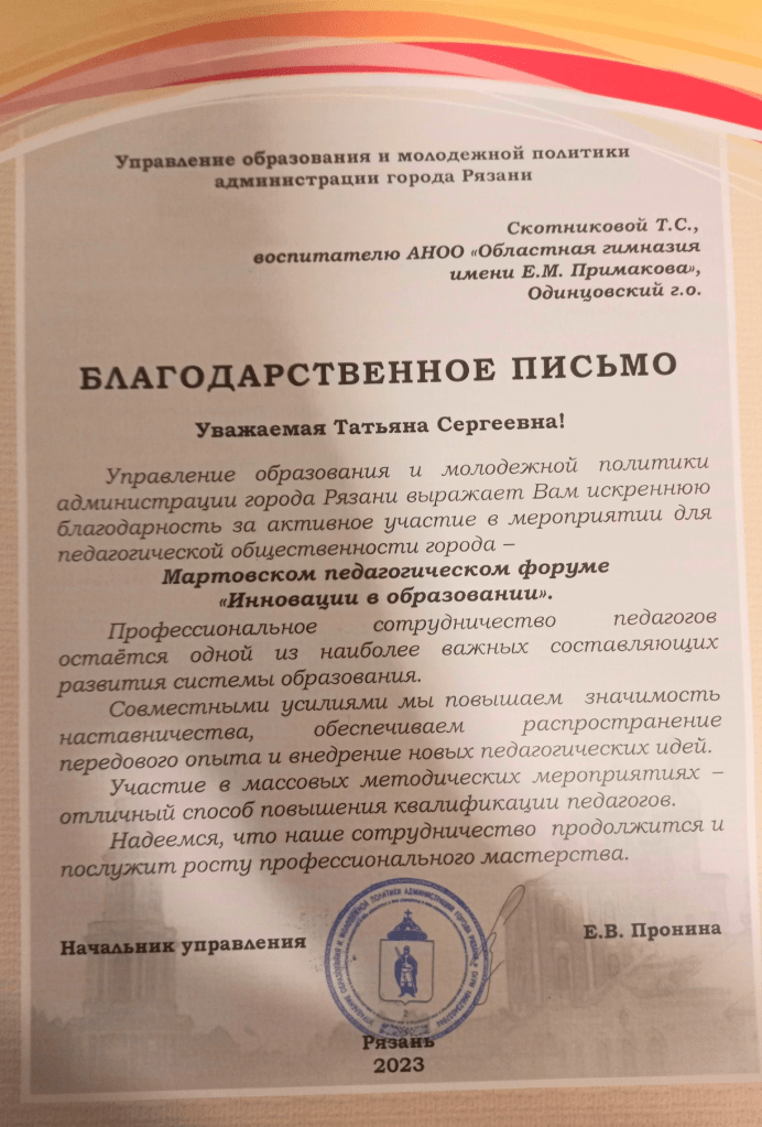По итогам выступления в педагогической лаборатории в Рязани Татьяна Сергеевна получила сертификаты и благодарственные письма